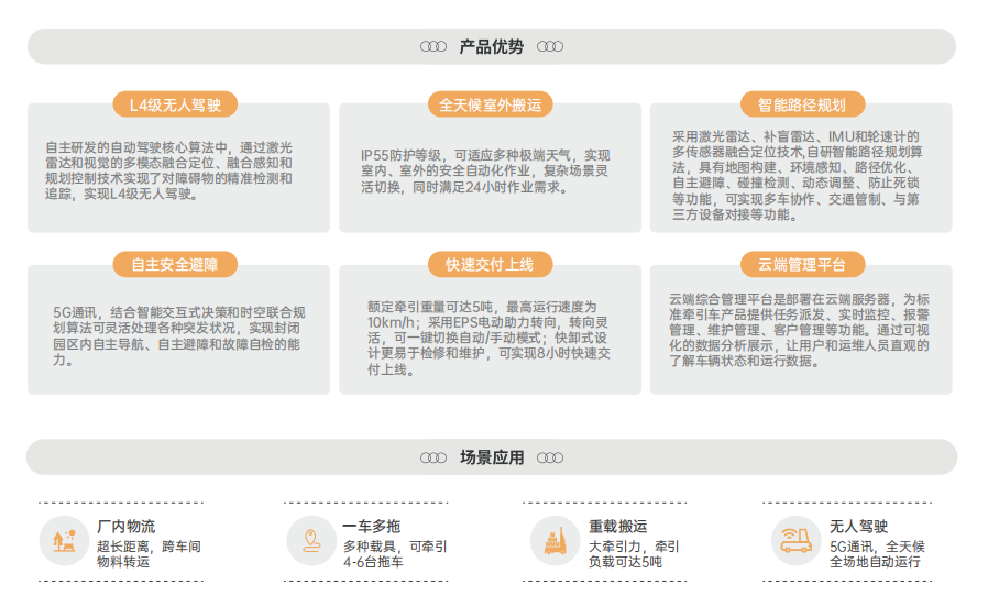螞蟻機器人無人駕駛牽引車,采用自主研發(fā)的L4級無人駕駛核心算法,通過激光雷達和視覺的多 模態(tài)融合感知技術實現了對障礙物的精準檢測和追蹤,智能交互式決策和時空聯合規(guī)劃算法打造 封閉園區(qū)內自主導航、自主避障和故障自檢的能力。從車端、路端、云端設計了多重保障,實現 7×4小時安全穩(wěn)定運行。